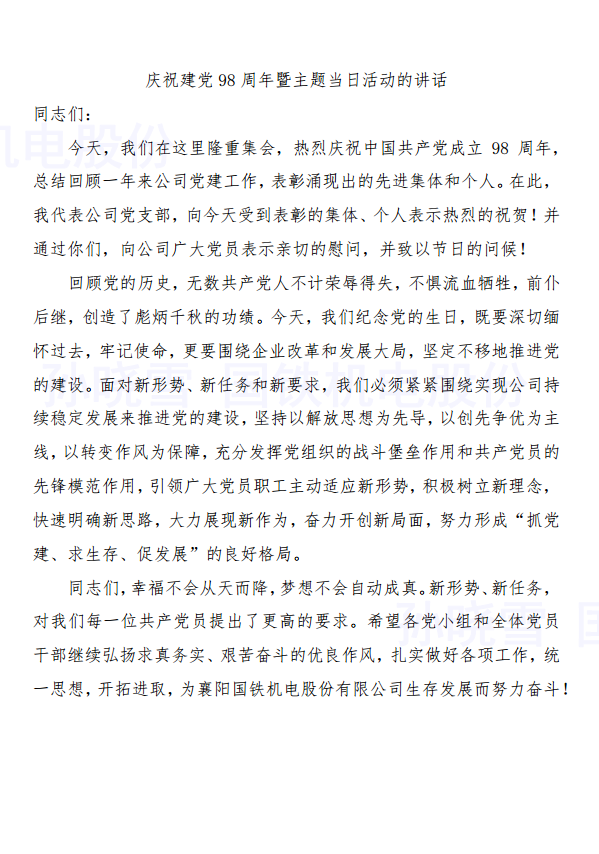 今年是建黨98周年。7月1日,襄陽國鐵機電股份有限公司以傳承紅色基因、弘揚革命精神展開了紀(jì)念活動。