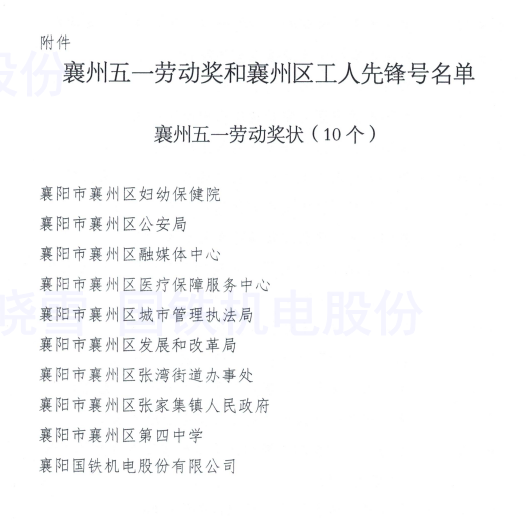 熱烈祝賀:襄陽(yáng)國(guó)鐵機(jī)電股份有限公司被襄州區(qū)總工會(huì)授予五一勞動(dòng)獎(jiǎng)狀、襄陽(yáng)國(guó)鐵機(jī)電股份有限公司曾建勇勞模創(chuàng)新工作室被襄陽(yáng)市總工會(huì)和襄州區(qū)總工會(huì)授予職工(勞模、工匠)創(chuàng)新工作室!