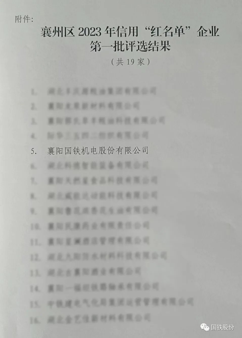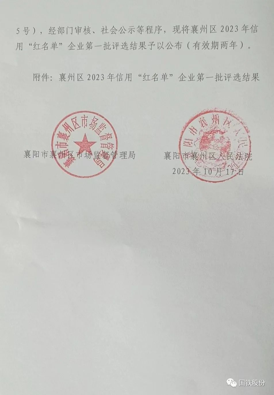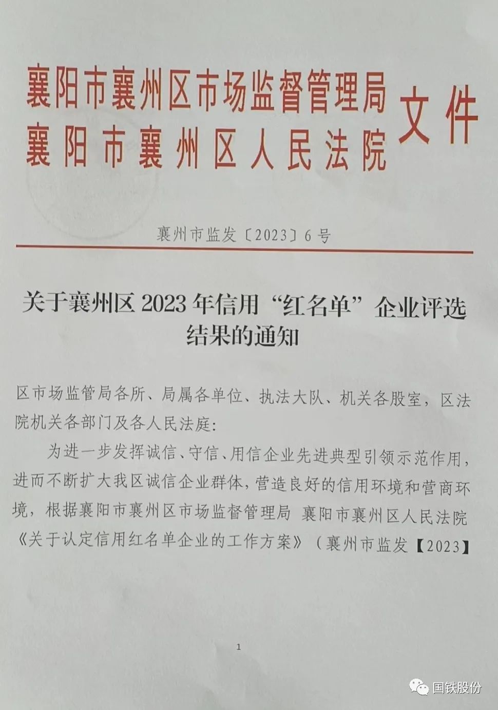 【喜報】國鐵機(jī)電獲“襄州區(qū)2023年信用‘紅名單’企業(yè)”榮譽(yù)