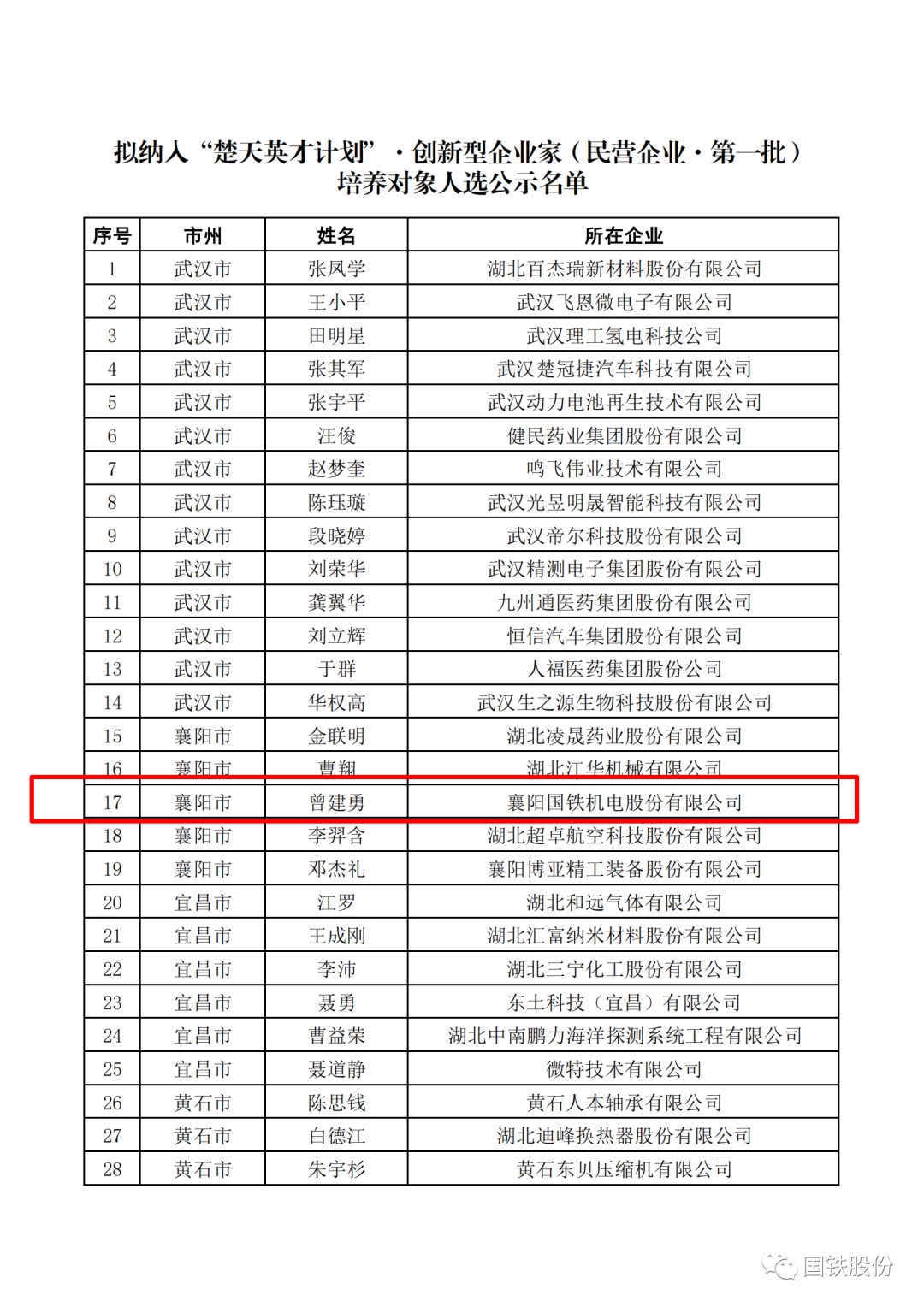 喜報(bào)!國鐵機(jī)電董事長(zhǎng)曾建勇入選“楚天英才計(jì)劃”·創(chuàng)新型企業(yè)家培養(yǎng)對(duì)象